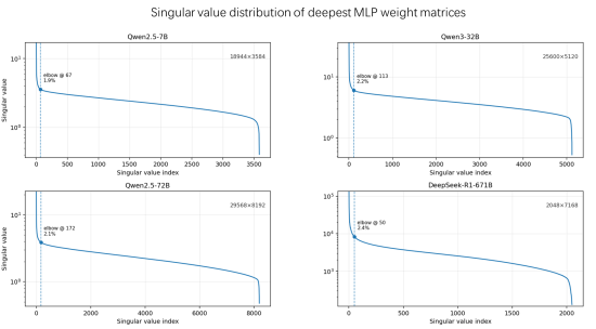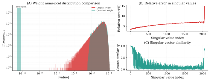 信息分布的不均衡:各向异性推动主导奇异值快速增长,显著增大参数矩阵方差,导致数值分布范围急剧扩展。且当能量集中在大奇异值方向时,小奇异值对应的信息被不断挤压,甚至接近“隐形”。这些小值虽然幅度不大,却往往蕴含模型细节和长尾知识。一旦在量化过程中被舍弃,就会对模型表现造成实质性损伤。