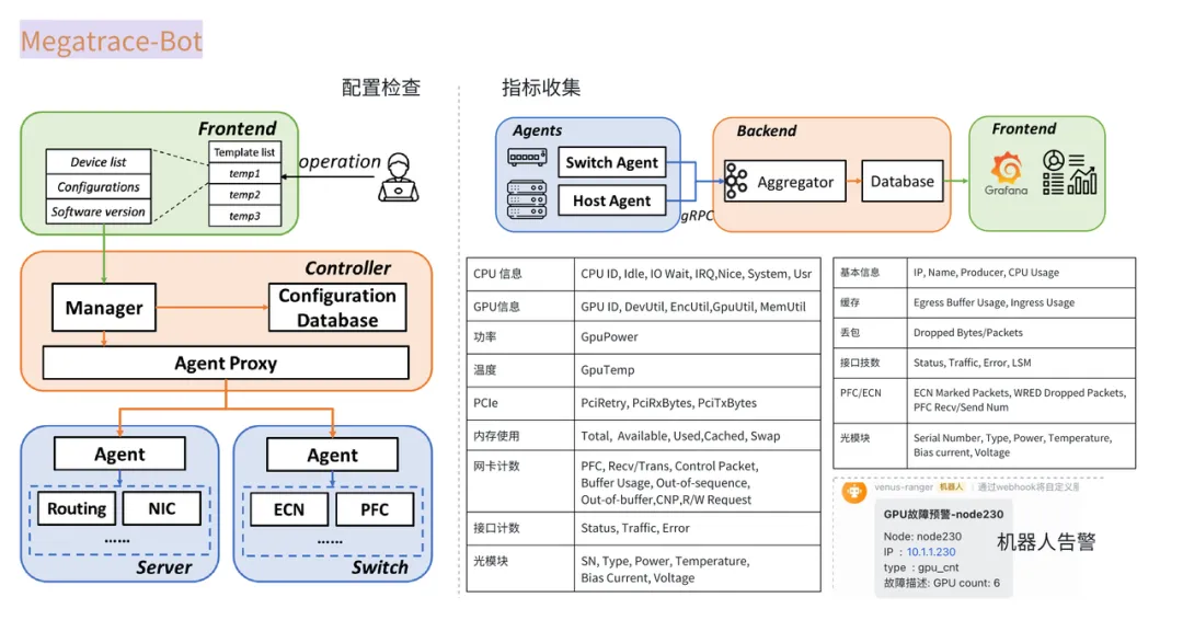 MegaTrace 内置的 巡检机器人 Bot 已在创智学院算力平台稳定运行,形成了完整的 “探测 – 巡检 – 告警 – 恢复” 运维闭环: