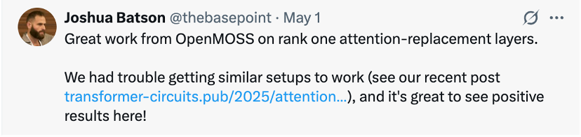4. 现在:Lorsa和CLT形成了一种互补。我们现在已经具备了可以完全稀疏替代Transformer的技术路线,我们现在正在整理我们的技术报告,争取在Anthropic之前发布。