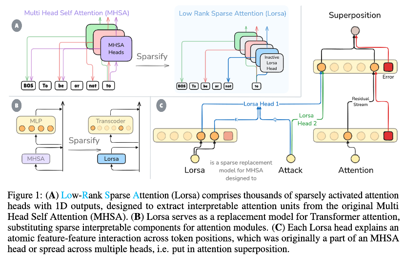与Anthropic主要针对MLP层进行稀疏化不同,Lorsa首次实现了对注意力层的稀疏化分解,填补了Transformer可解释性研究中的关键空白。