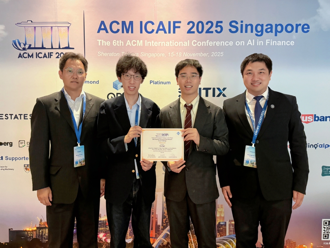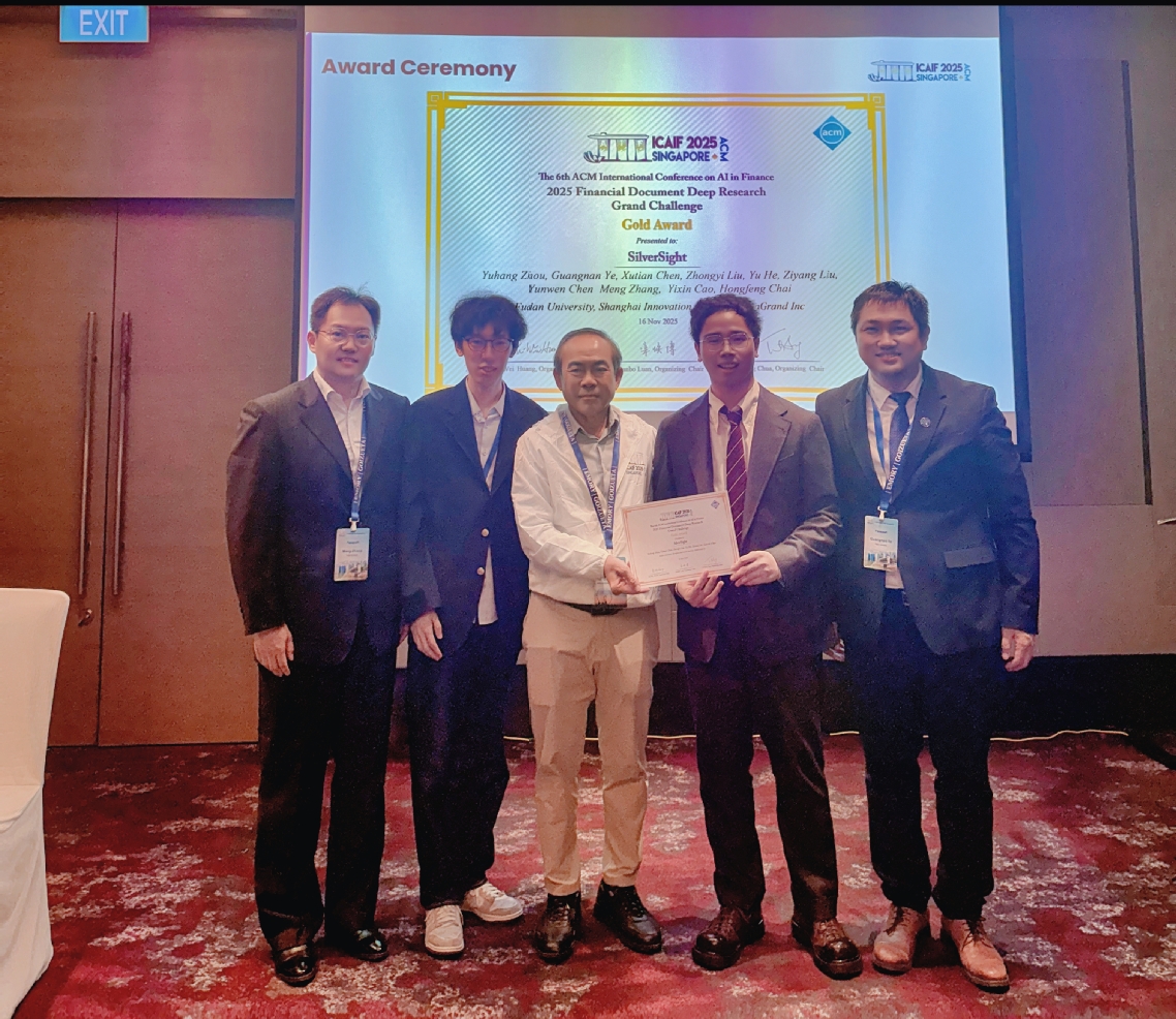图二:ICAIF FinDDR 2025颁奖照片,左起:张猛教授、博士生何昱、大会主席NUS Prof.Tat-Seng Chua、博士生周宇航、叶广楠教授