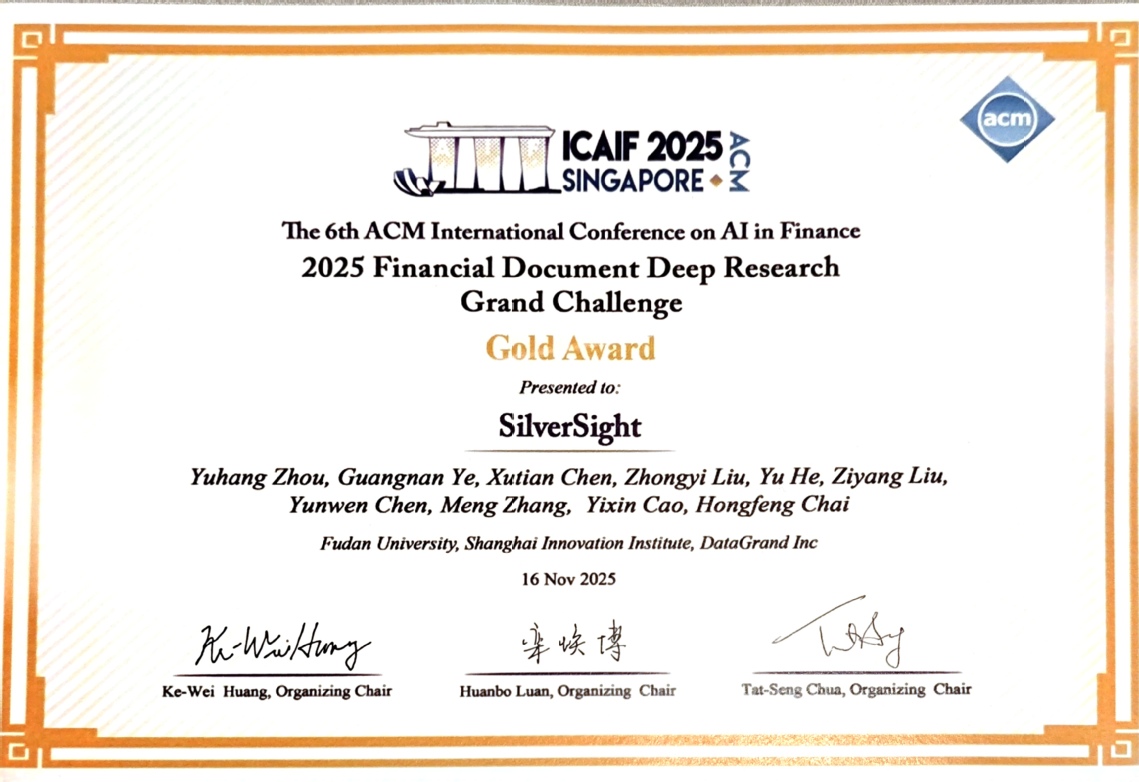 近日,在新加坡举办的第六届 ACM国际人工智能与金融会议(ICAIF 2025)核心赛事—— 金融文档深度研究挑战赛(FinDDR 2025)中,上海创智学院联合复旦大学、达观数据组成的团队从包括微软、富国银行、美国RPI 大学、新加坡国家科学院(A*STAR)在内的来自全球七个国家的数十家顶尖金融科技科研机构中脱颖而出,斩获国际冠军。