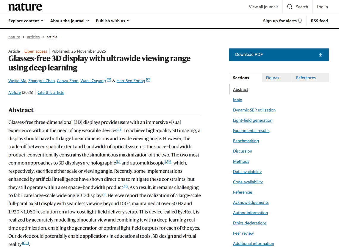 今天,《Glasses-free 3D display with ultrawide viewing range using deep learning》一文在国际顶级学术期刊《Nature》正刊发表。文章提出一种无缝超广角大尺寸裸眼三维显示解决方案,该成果在国际上首次突破了这一长达数十年的僵局,实现了受限物理信息瓶颈下依然可以同时实现桌面级尺寸与超宽连续视角的共存。