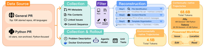 ·PR数据提供"知识和广度":跨语言、跨框架的软件工程模式,让模型见识足够多的"什么样的问题对应什么样的解决思路";
