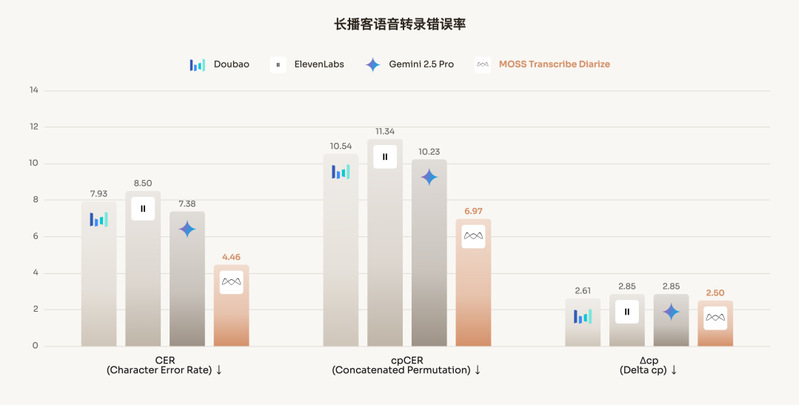 ·最佳的 Δcp 指标(说话人分离性能 ):相比于其它因为长音频切片而导致的说话人识别不一致的模型,MOSS-Transcribe-Diarize 保持了最好的说话人标签准确性和一致性。