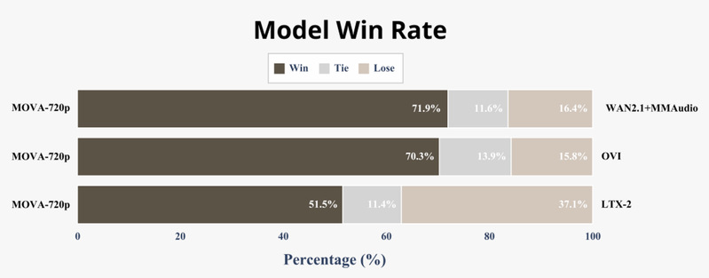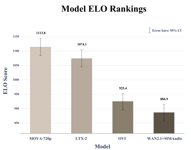考虑到当前音视频生成模型的客观评价体系仍不够完善,MOVA 引入了竞技场(Arena)人为主观评测范式,包含了全球最新的开源音视频生成模型,累计获得 5000 次有效投票并对结果进行了系统统计。评测结果显示,MOVA 生成内容在整体偏好上保持领先:其在对战中更频繁获得用户选择,ELO 评分达到了 1113.8(初始分 1000),显著高于各基线模型;并稳定保持超过 50% 的胜率,其中面对 OVI 和级联系统(WAN+MMAudio)的胜率更是超过了 70%。