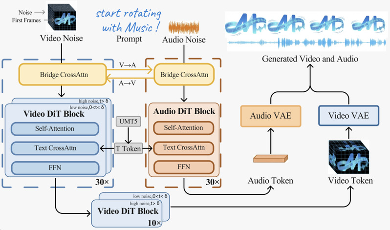 在这两座「塔」之间,团队引入了一个双向桥接模块(Bridge)。这个模块的存在,让视频与音频的隐藏状态在每一层都能进行深度的交叉注意力运算。这意味着画面在生成的每一瞬间,图像都在感知声音的节奏,而音频也在捕捉画面的光影。