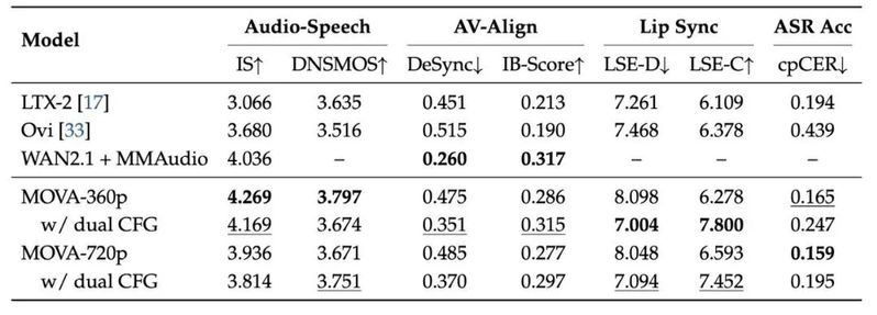 在最能拉开差距的口型同步(Lip-sync)任务中,MOVA 展现出了明显的优势。根据 Lip Sync Error 指标,在开启 Dual CFG 模式后,MOVA-720p 的 LSE-D 得分为 7.094,LSE-C 得分为 7.452。其次,在反应语音准确度和说话人切换准确度的 cpCER 指标上,MOVA 也取得了最佳的结果。
