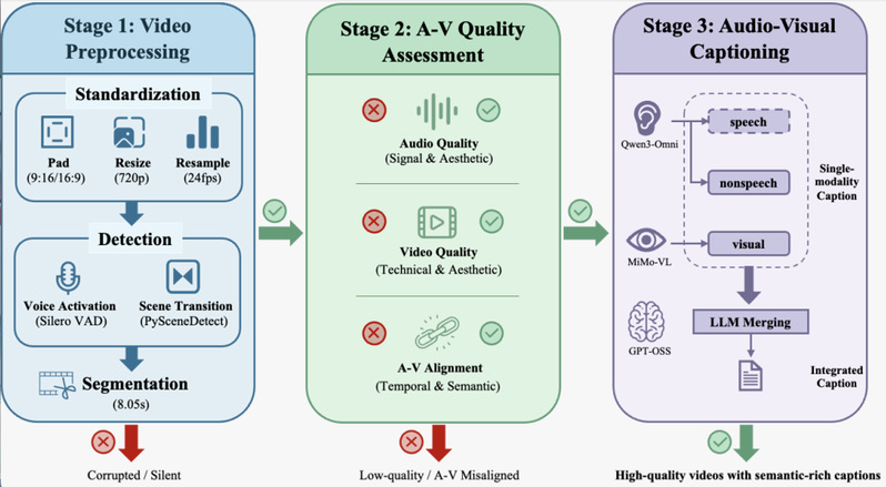 成功的模型根基于架构,更离不开数据。多阶段的高质量音视频数据处理管线是 MOVA 成功规模化的保障。