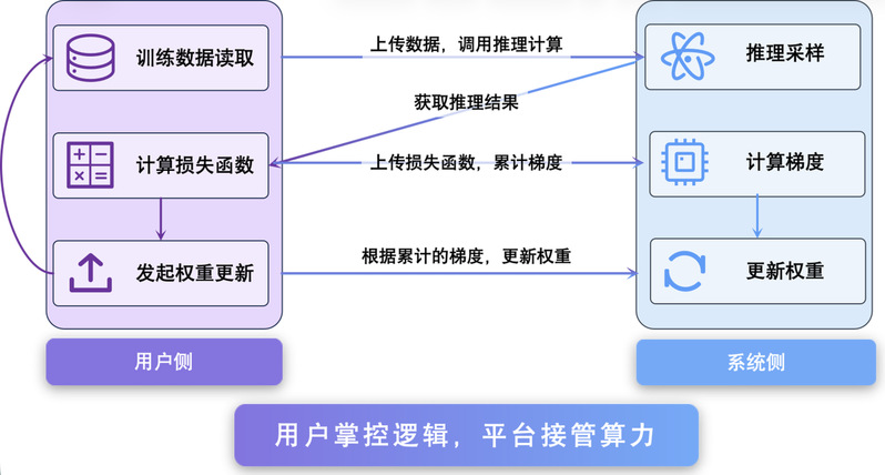传统的超算或智算中心主要采用“作业提交”模式,即申请资源、提交代码、等待结果,这种模式本质上是资源的租赁,将复杂的工程化难题留给了科研团队。TaaS 则确立了“原子化服务”的新范式。在传统模式下,科研人员需要自行编写包括数据加载、并行策略、断点保存及分布式通信在内的复杂系统代码;而在 TaaS 模式下,这些底层复杂性被封装为 client.train_step、client.generate 等原子化 API。科研人员仅需数行代码即可调用完整的训练能力,无需关注底层算力硬件类型或分布式细节。这种设计让科研人员能够从繁琐的底层工程中解脱出来,将精力集中于科学问题的逻辑构建上。