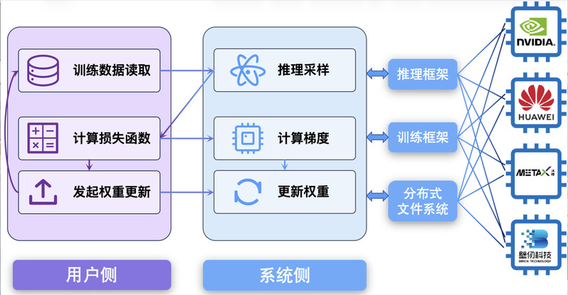 ·基础模型训练集群:专注于策略更新,支持跨数据中心(DC)的数据并行训练,处理高吞吐的梯度计算。 两者通过统一存储层进行异步协同:训练集群产生的权重更新信号与模型快照写入存储层后,推理服务通过版本控制协议自动同步最新权重。这种架构不仅保障了大规模训练的稳定性,更解决了传统模式中显存资源争抢的难题,显著提升了科研迭代的整体效率。