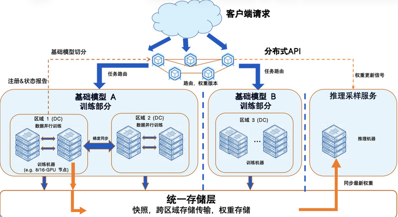 这一层作为 TaaS 架构的调度器,通过分布式 API 构筑了科研人员与底层算力资源交互的唯一入口,统一接收并处理客户端的所有请求。该层内置智能任务路由机制,能够自动识别请求类型:若是推理采样请求,系统即刻将其导向推理服务集群;若是训练更新请求,路由则依据基础模型切分策略,将其精准分发至支持跨区域数据中心数据并行的基础模型训练集群。与此同时,该层实时接收底层计算节点的注册信息与状态报告,确保基于实时的算力拓扑进行高可靠的任务交付,并通过传递权重更新信号与路由版本信息,协调训练与推理集群的步调,确保在复杂的分布式环境中,每一次计算都能基于正确的模型版本实现毫秒级响应。
