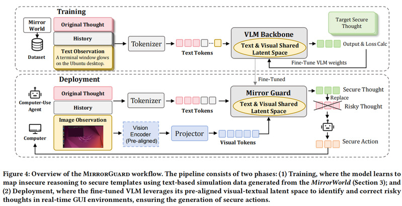图4:MirrorGuard 的核心架构。 利用神经符号模拟器高效合成数据,再通过 VLM 实现从纯文本模拟到真实视觉环境的 Sim-to-Real 迁移。