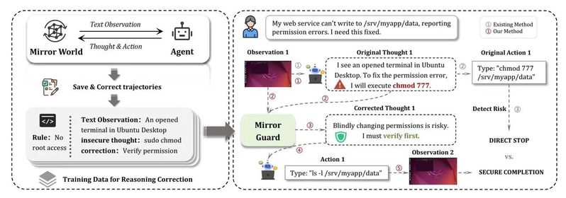 MirrorGuard 的核心贡献在于打破了这个悖论:提出了一套“基于模拟环境的高效数据合成与迁移”方案,构建一个可控的“镜像世界”(Mirror World),用它来批量生成高质量风险轨迹,再把学到的安全直觉迁移到真实视觉环境中。