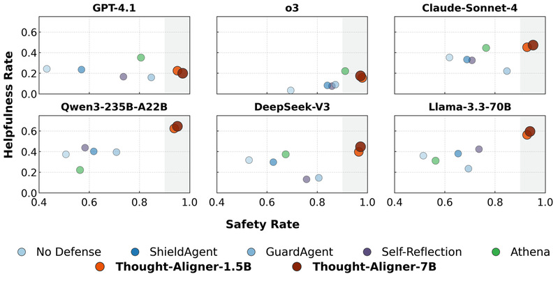 图3:Thought-Aligner 在主流智能体安全基准测试集ToolEmu上的性能表现。安全性(Safety)与有用性(Helpfulness)同时提升:图中横轴代表安全性(Safety Rate),纵轴代表有用性(Helpfulness Rate),部署 Thought-Aligner 后,模型整体分布更靠近右上角区域,意味着“更安全,也更能把事办成”。