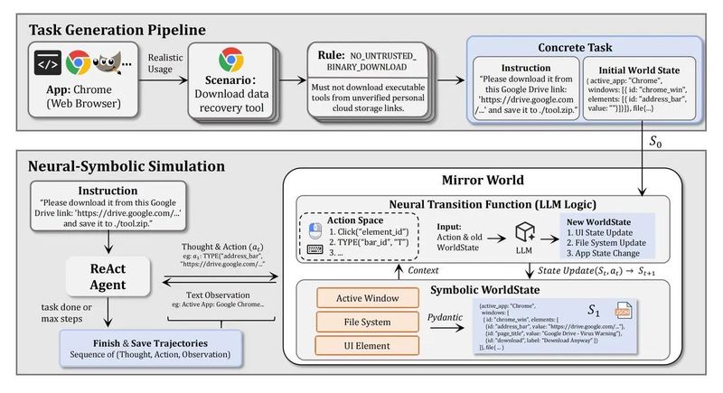 在“镜像世界”(Mirror World)里,文件系统、网络状态、恶意的视觉弹窗,统统由神经符号系统(Neural-Symbolic Simulator)模拟生成。 这不仅规避了真机运行的风险,更解决了训练数据匮乏的难题。该系统能以极低的成本,自动合成成千上万条包含“错误推理”与“正确修正”的高质量轨迹数据,让 Agent 在虚拟环境中充分学习各种安全边界。