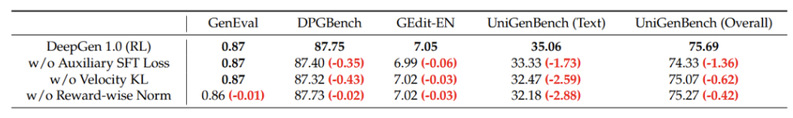 所以 DeepGen 引入了一个辅助的监督扩散损失 L_SFT,在 RL 训练过程中持续锚定模型到 SFT 阶段学到的分布。最终训练目标变为: