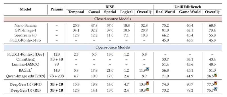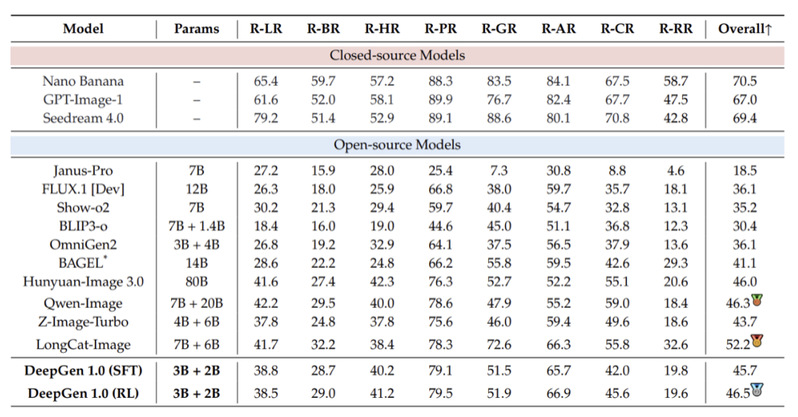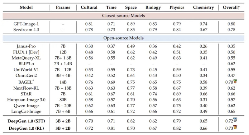 WISE(世界知识推理生成)上,DeepGen 1.0(RL)拿到0.73,在开源模型中处于领先位置。与其他更大的开源模型对比: