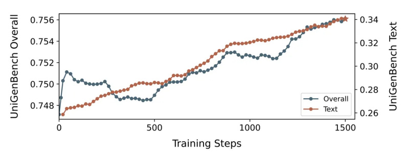 ·去掉辅助 SFT Loss:UniGenBench 整体从 75.69 跌到 74.33(-1.36),文字渲染得分从 35.06 跌到 33.33(-1.73)。从训练曲线看,约 300 步后性能开始持续下降