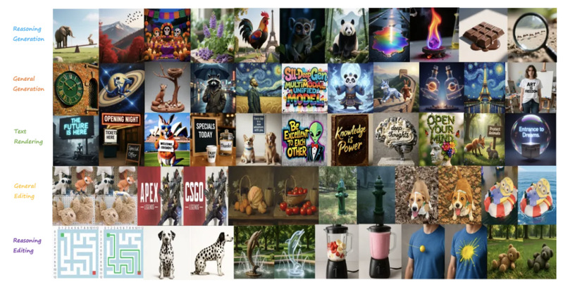 通过 SCB 架构的多层特征桥接、Think Tokens 的隐式推理增强、三阶段渐进训练、以及 MR-GRPO 的混合奖励强化学习,一个 5B 参数的模型做到了在推理生成和推理编辑上领先,同时在通用生成和编辑上保持竞争力。