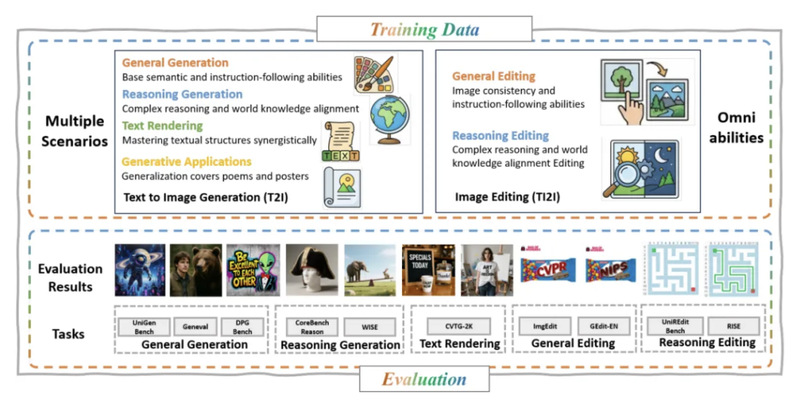 ·Stage 2 - 联合 SFT:解冻 DiT,同时对 VLM 施加 LoRA 做端到端联合训练,在一个涵盖通用生成/编辑、推理生成/编辑、文字渲染的多任务混合数据上进行优化