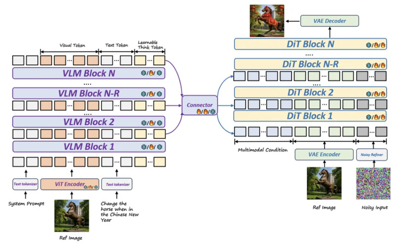 VLM 负责处理文本和图像输入,提供丰富的多模态语义理解;DiT 作为生成解码器,在 VLM 提供的多模态条件引导下生成高质量图像。两者之间通过一个精简的 encoder based connector 模块进行特征对齐。