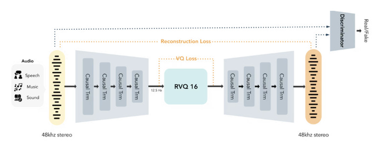 ●高压缩比与变比特率:支持将 48KHz 立体声音频压缩至 12.5 fps。基于 16 层 RVQ 机制,模型可在 0.125-2kbps 范围内实现灵活的码率调节,满足不同场景下的高保真重建需求。
