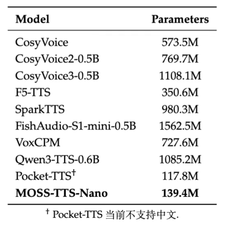 MOSS-TTS-Nano 的回答是:用极致的架构创新,在“参数做减法”的同时,实现“音质与语种的全面升舱”。下图展示了 MOSS-TTS-Nano 与主流 TTS 系统的参数规模对比:可以发现,当前大多数支持中英文的 TTS 系统参数规模集中在 1B 级别, 而 MOSS-TTS-Nano 仅用 0.1B 参数量,就实现了同等级别的核心能力。