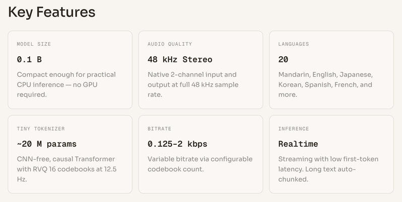 MOSS-TTS-Nano不仅能在纯 CPU 环境下极速运行,更打破了过去轻量级 TTS 在音质和语种上的天花板:在仅 0.1B(1亿)的极小参数规模下,原生实现了 48kHz 双声道(Stereo)的高保真输入输出,并一口气支持了全球 20 种语言。